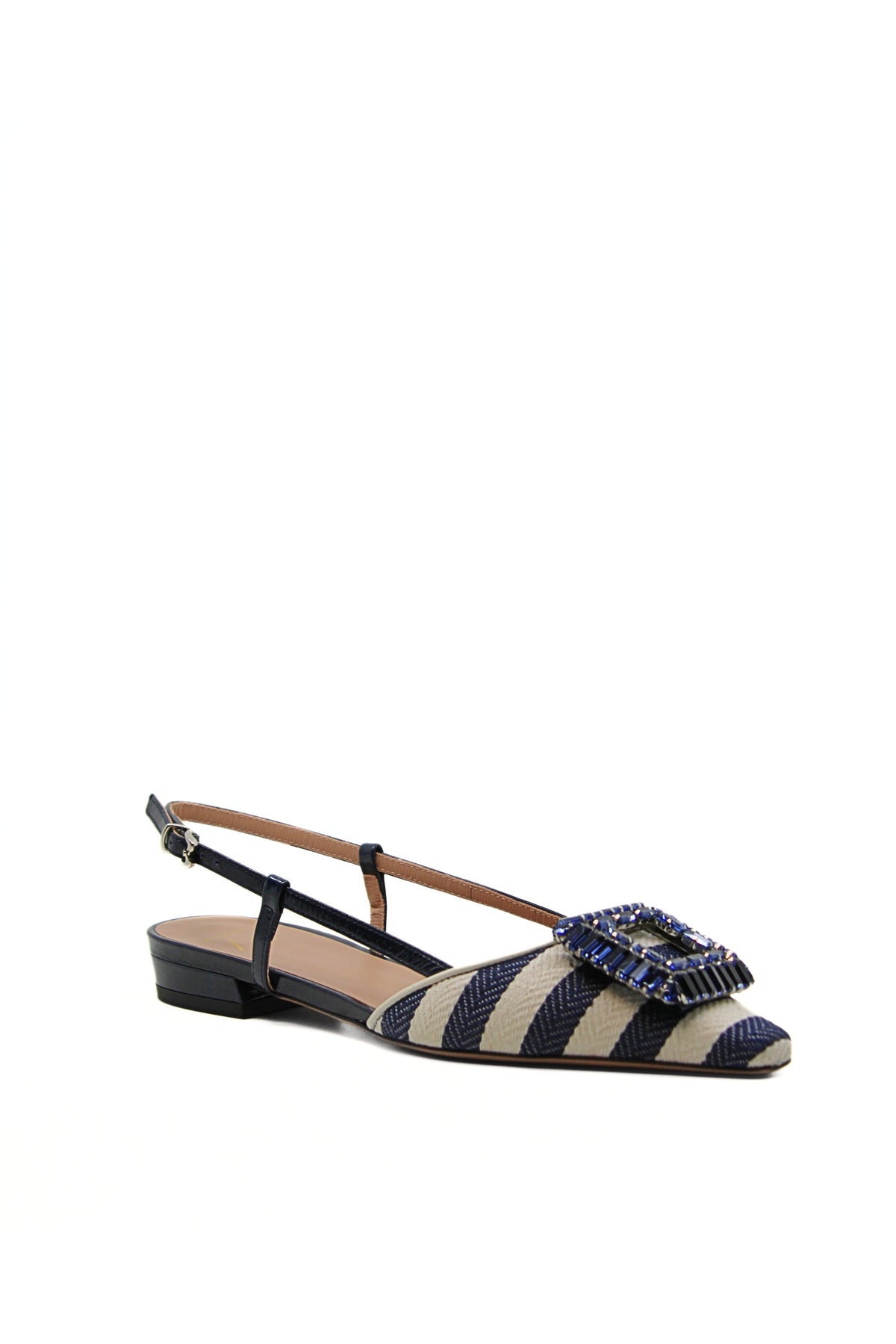 Slingback in in pelle, vernice e tessuto a righe beige chiaro e blu. Tacco alto 3cm. Con accessorio molto luminoso e pregiato blu sul davanti . Suola in vero cuoio naturale. Perfette per outfit eleganti e chic, senza rinunciare alla comodità.