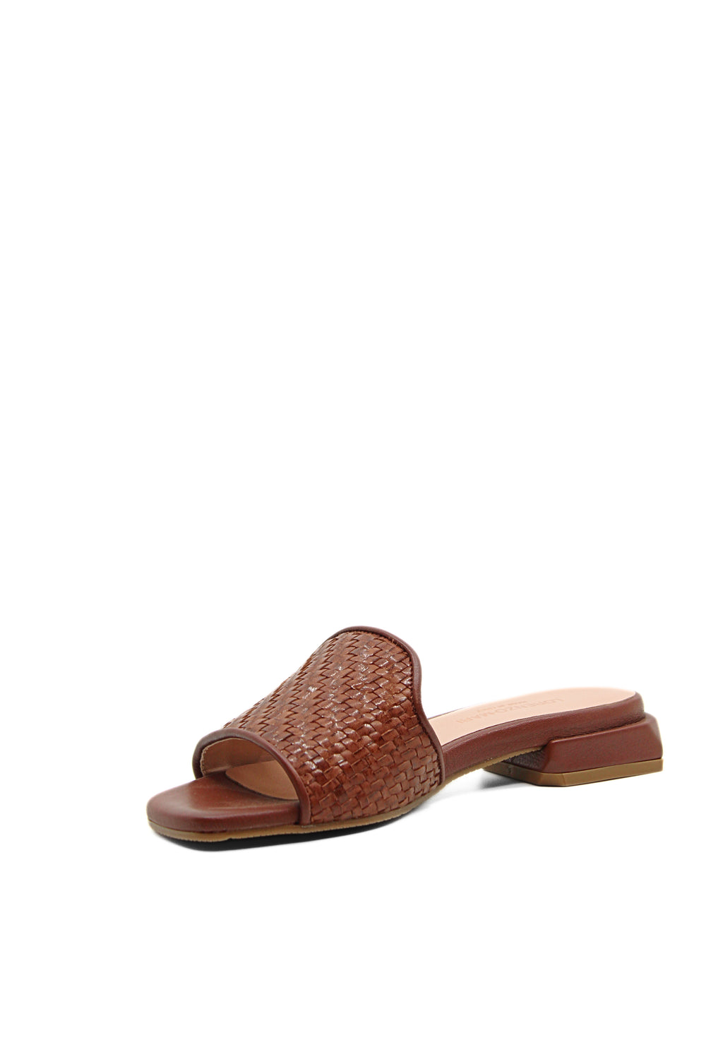 Ciabattina in pelle color cioccolato con tomaia sul davanti avvolgente in pelle intrecciata cuoio. Tacco largo sagomato comodo, alto 3cm Per un look esclusivo senza rinunciare alla comodità.