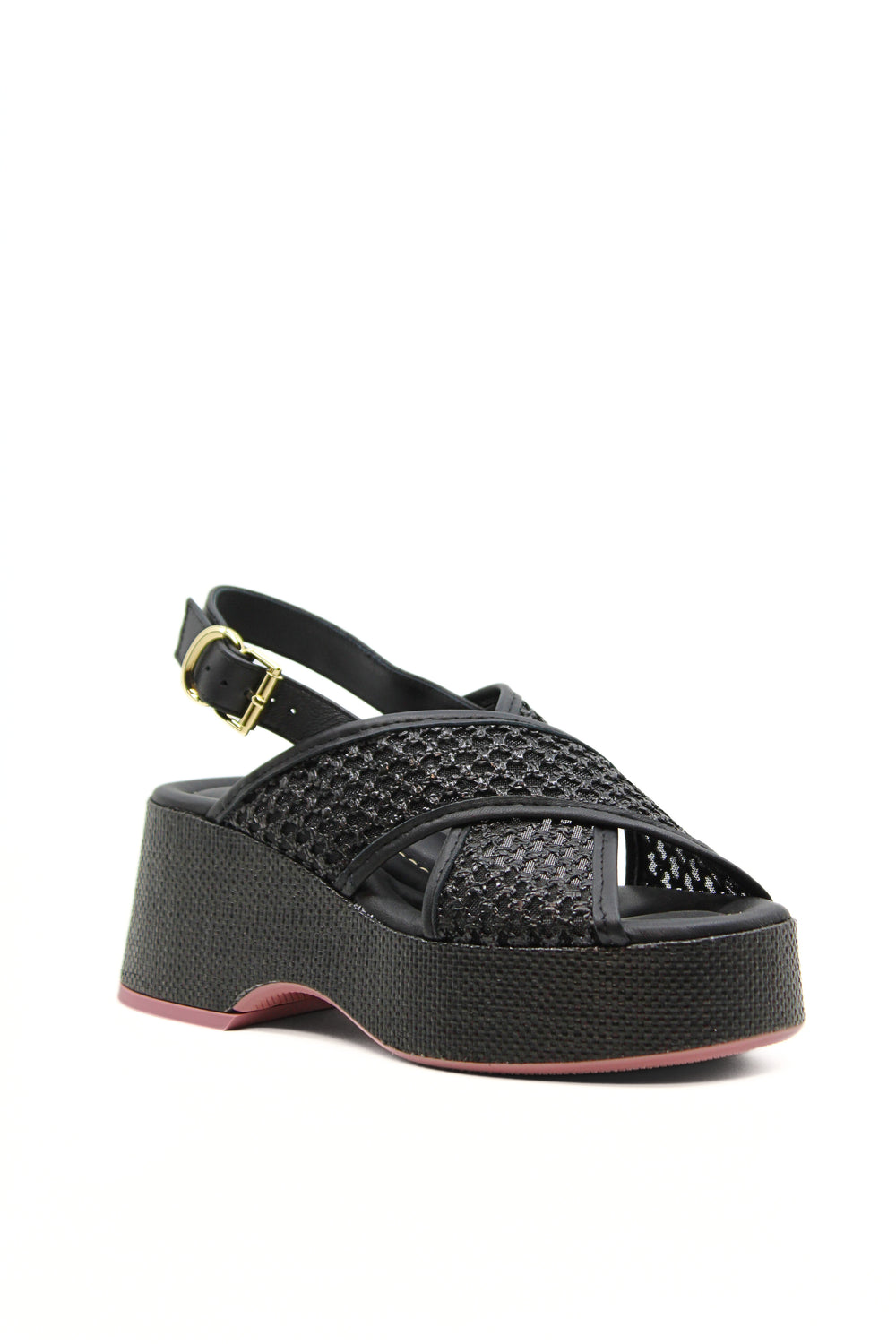 Zeppa in pelle nera con fasce incrociate in rete e intreccio in pelle. Altezza zeppa 7cm. Fondo gomma colorato rosa. Sottopiede imbottito per un comfort assoluto. Per un look esclusivo senza rinunciare alla comodità.