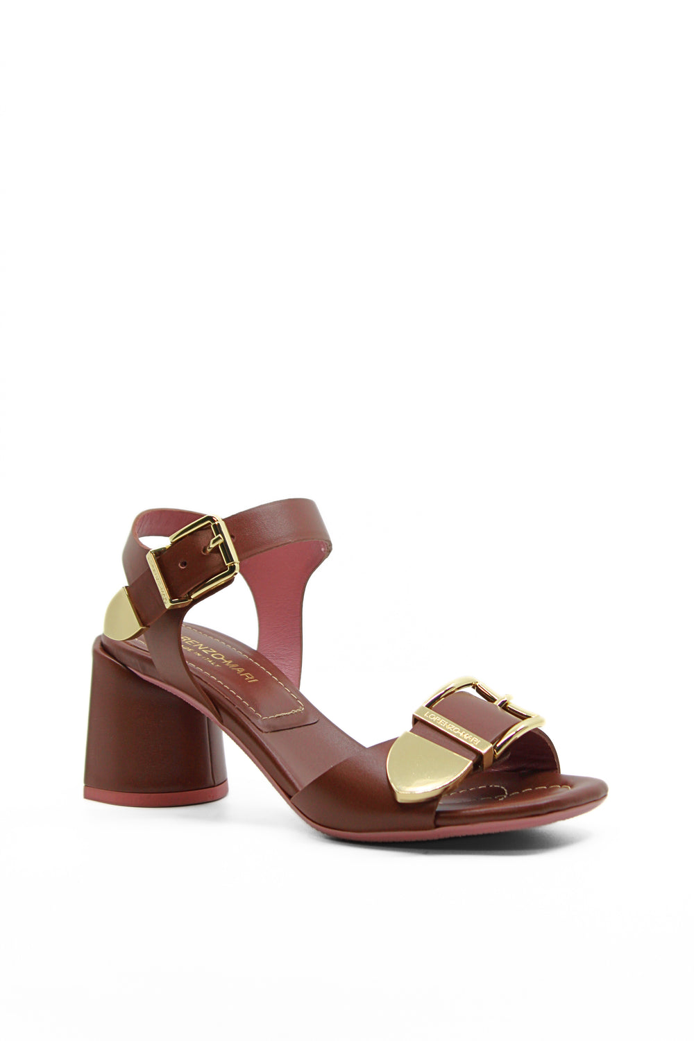 Sandalo in pelle cioccolato con fibbia in metallo platino sul davanti. Fibbia regolabile alla caviglia. Tacco sagomato rivestito in pelle. Sottopiede morbido imbottito. Suola in gomma antiscivolo. Per un look esclusivo senza rinunciare alla comodità
