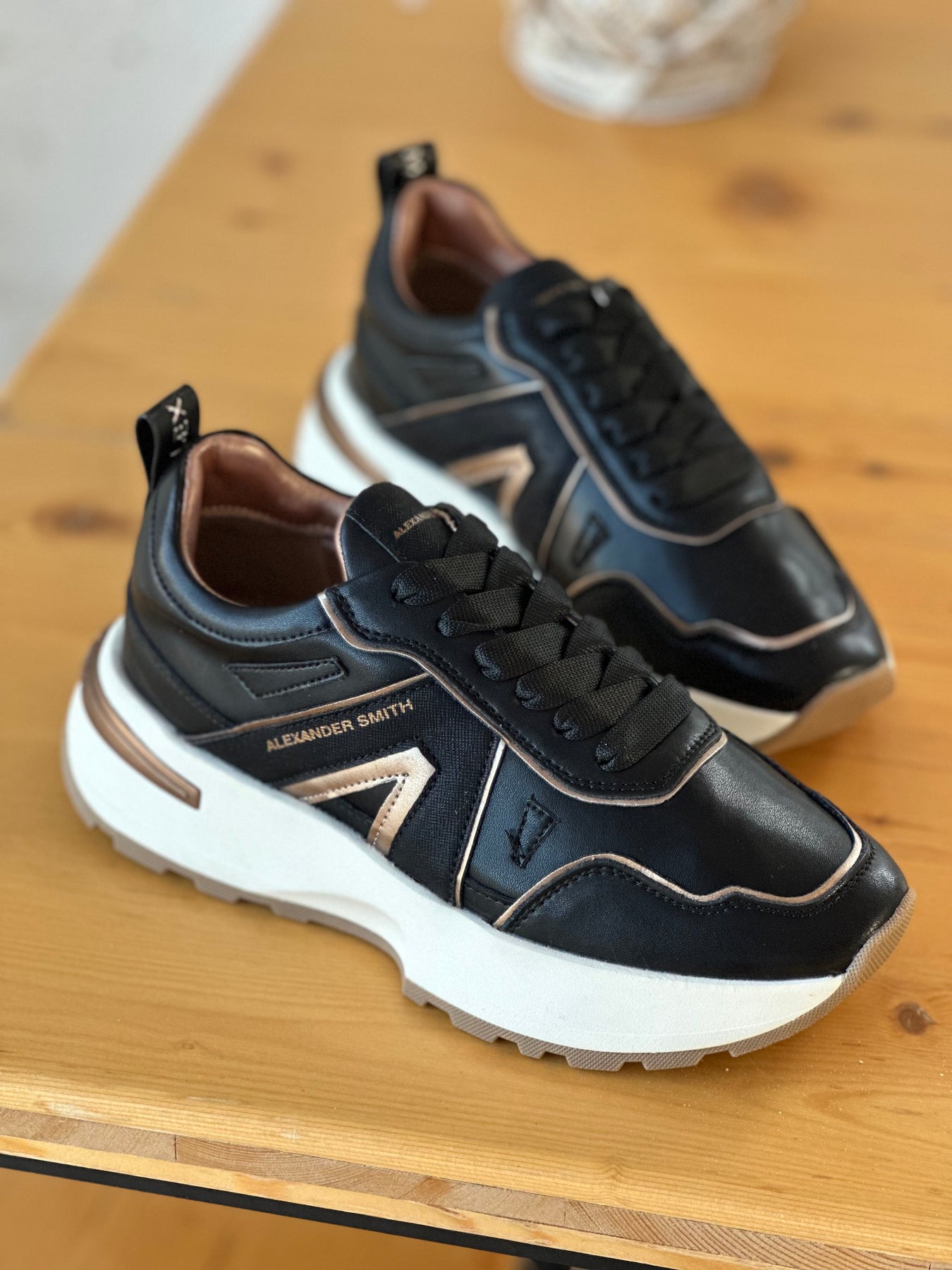 Il nuovo modello firmato Alexander Smith, che prende ispirazione da una delle città più iconiche del Regno Unito, è la nuova proposta running del brand: linea affusolata, suola importante e dettagli ricercati danno vita ad una sneakers versatile e distintiva, in questa variante in pelle nera con logo laterale in glitter. Altezza zeppa 5cm con soletto estraibile