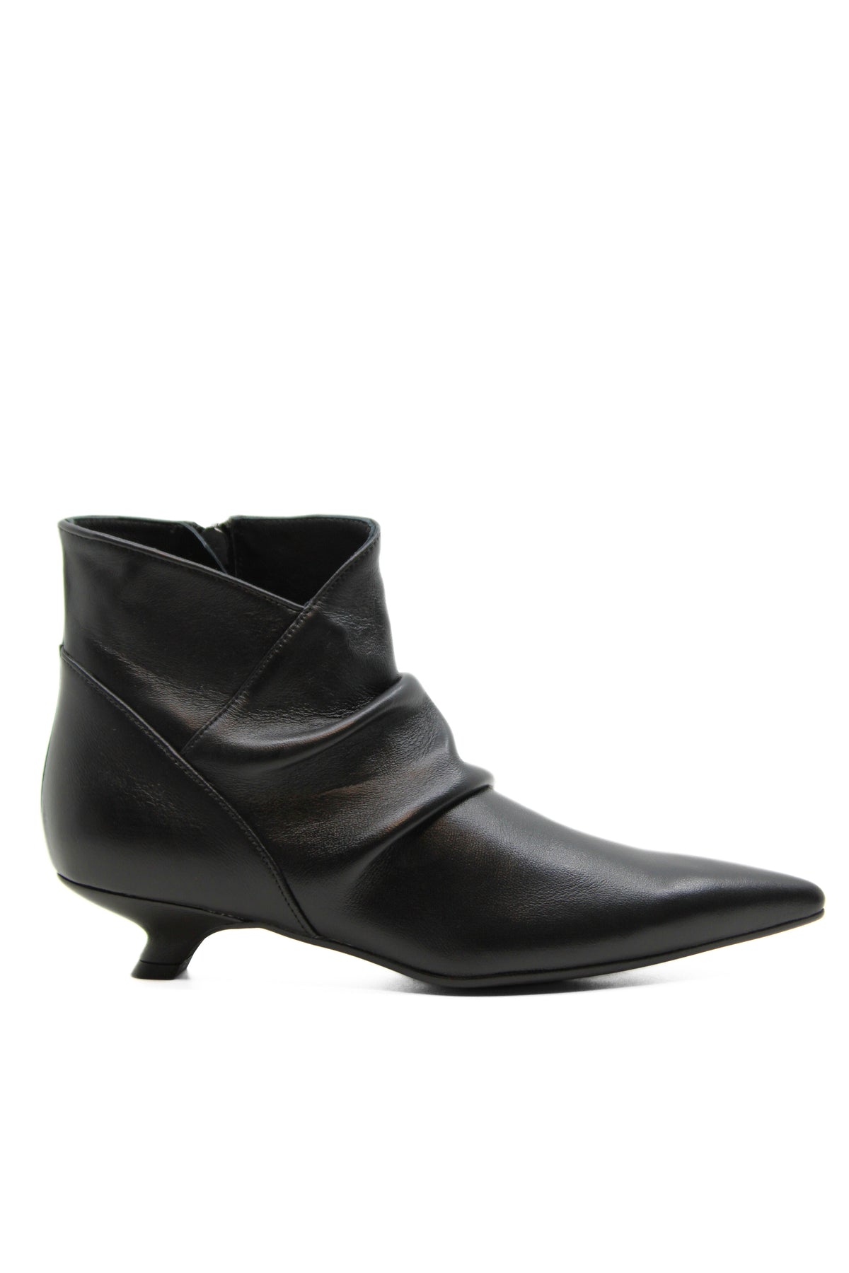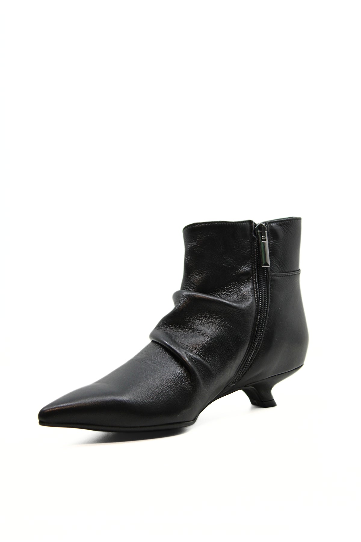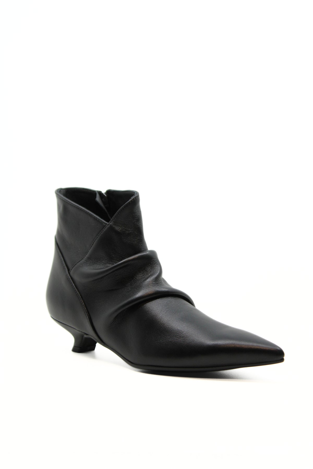 Tronchetto in nappa morbidissima e tacco scultura alto 3,5cm. La tomaia presenta delle pieghe sul davanti. Piccolo scollo a V sull'esterno del gambale. Zip interna laterale. Per un look esclusivo senza rinunciare alla comodità