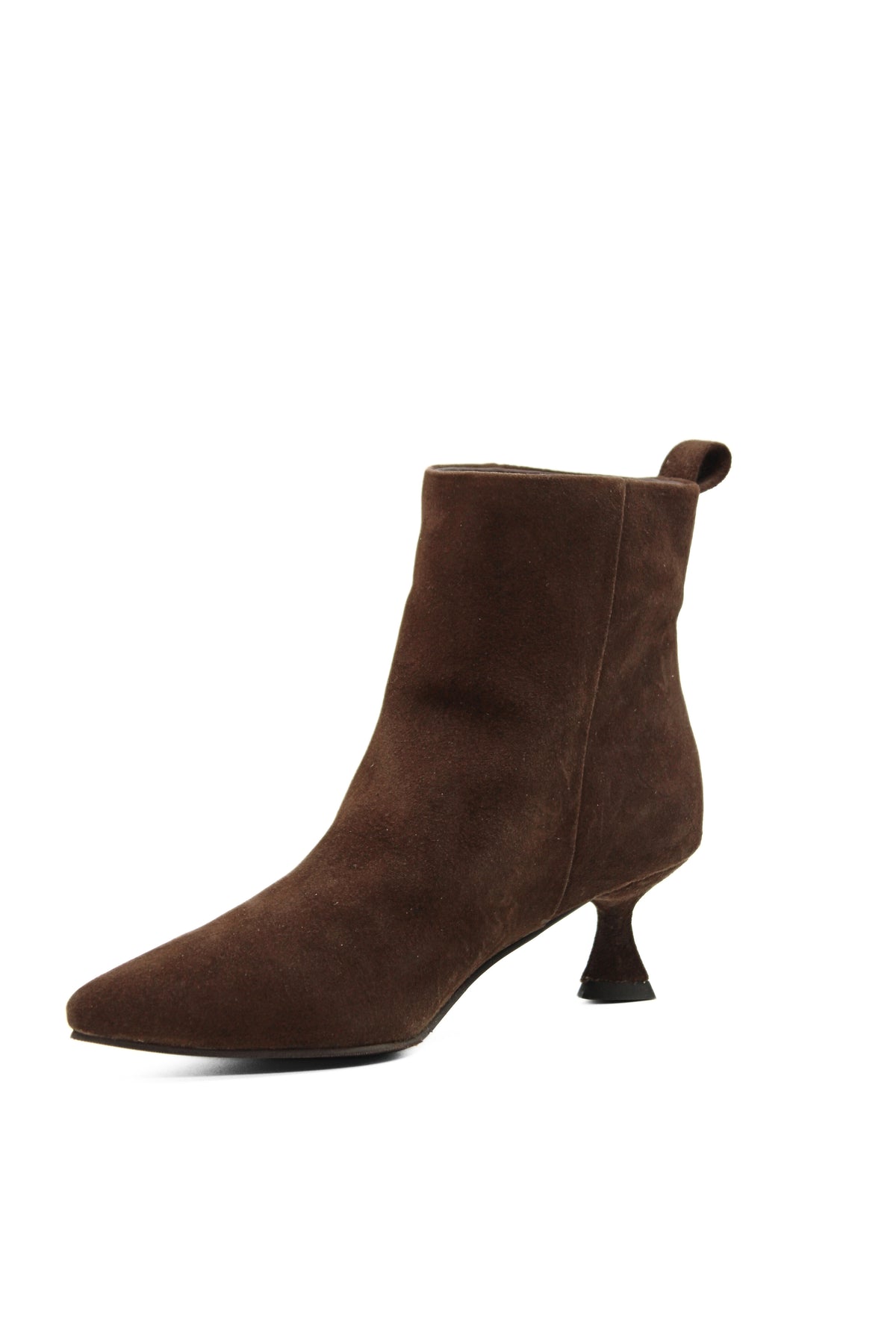 Tronchetto in camoscio marrone con tacco a rocchetto sagomato alto 5,5cm. Gambale ampio e di facile ingresso. Pianta comoda con suola in gomma antiscivolo. Per un look esclusivo senza rinunciare alla comodità