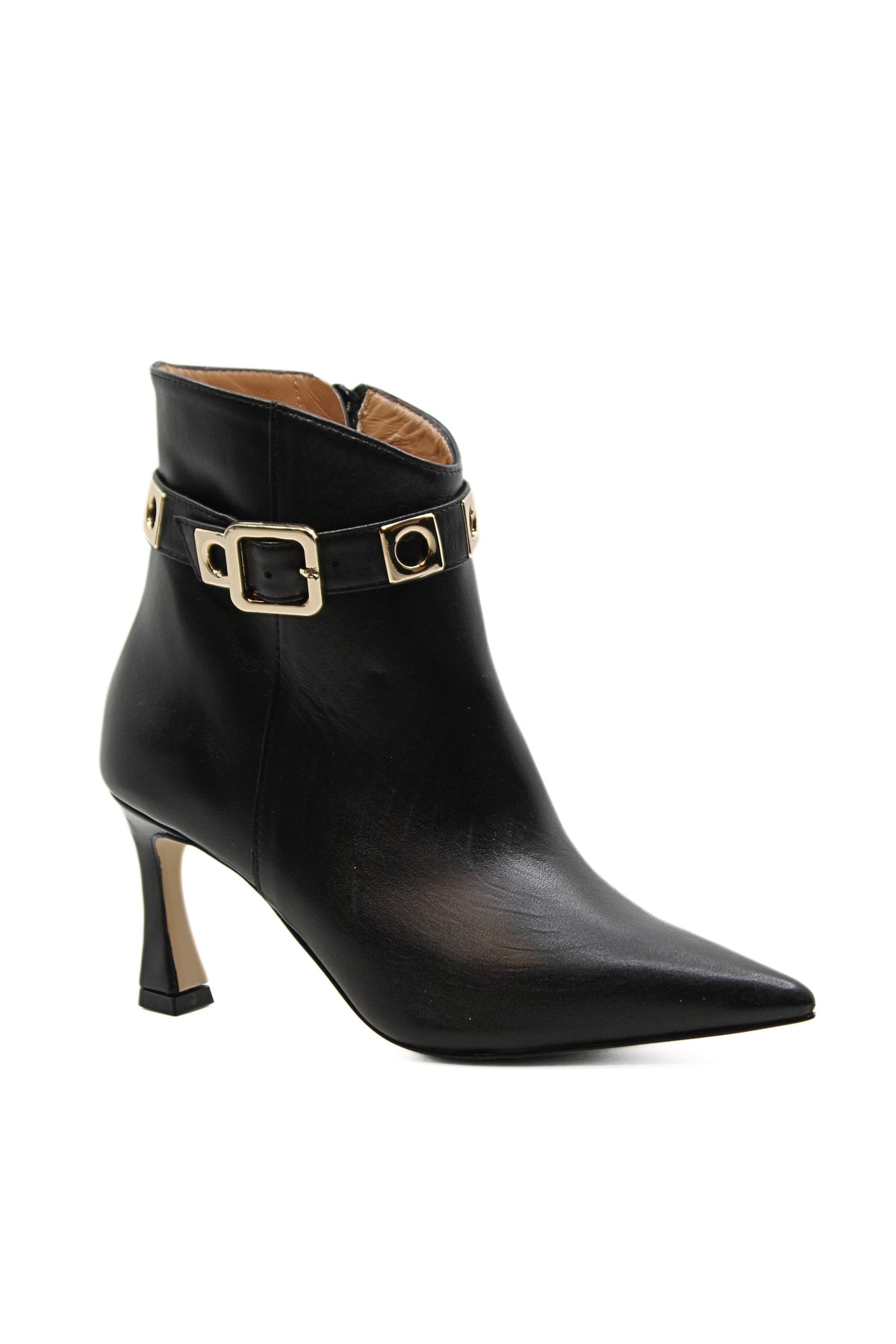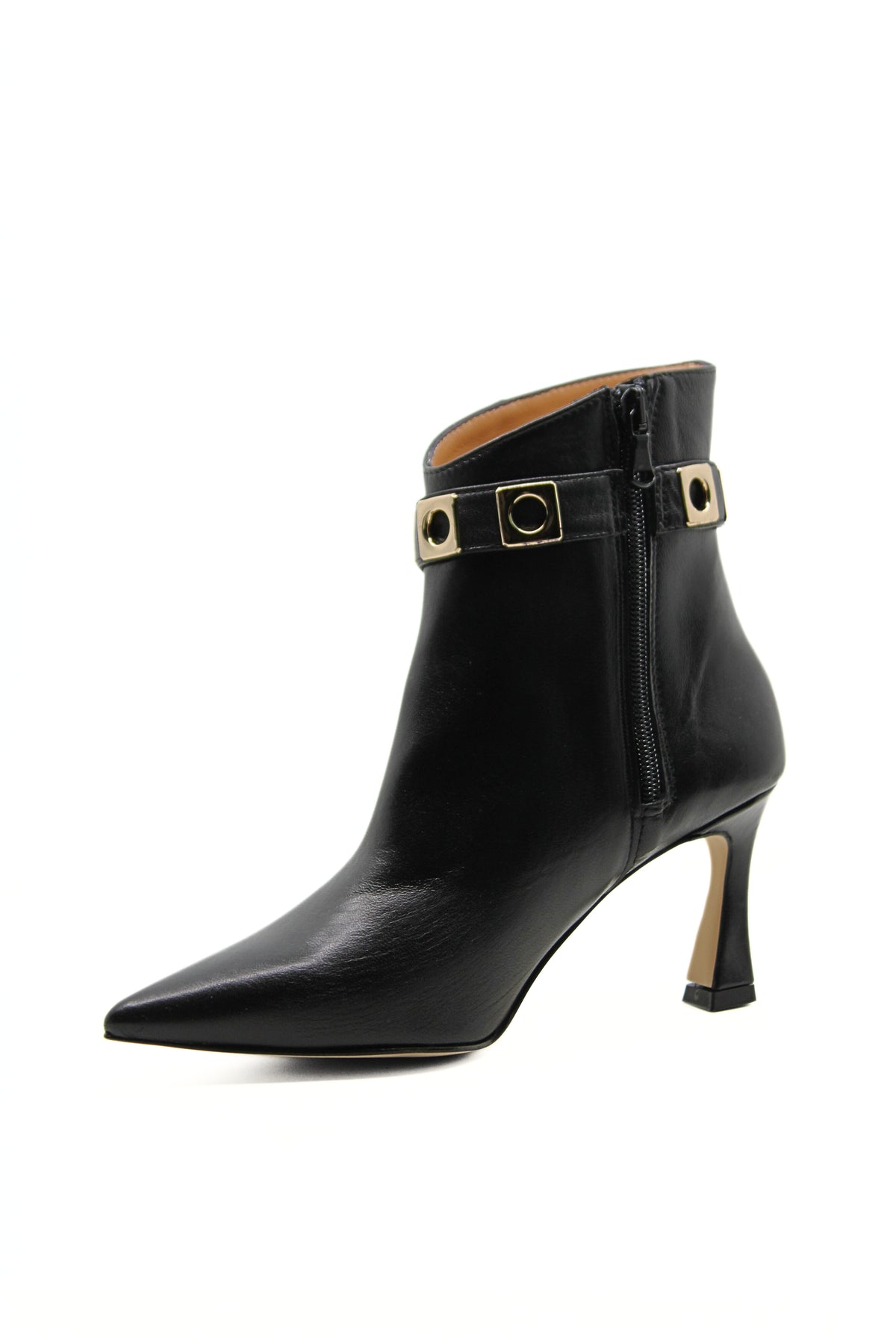 Tronchetto in nappa nero con tacco slanciato e sagomato comodo alto 7cm. Zip interna laterale, con accessorio in metallo platino lungo tutto il gambale. Lo scollo del tronchetto è trasversale, capace di slanciare ulteriormente la figura. Per un look esclusivo senza rinunciare alla comodità.