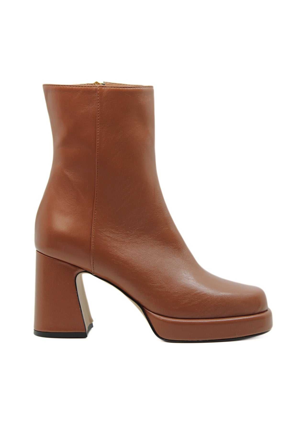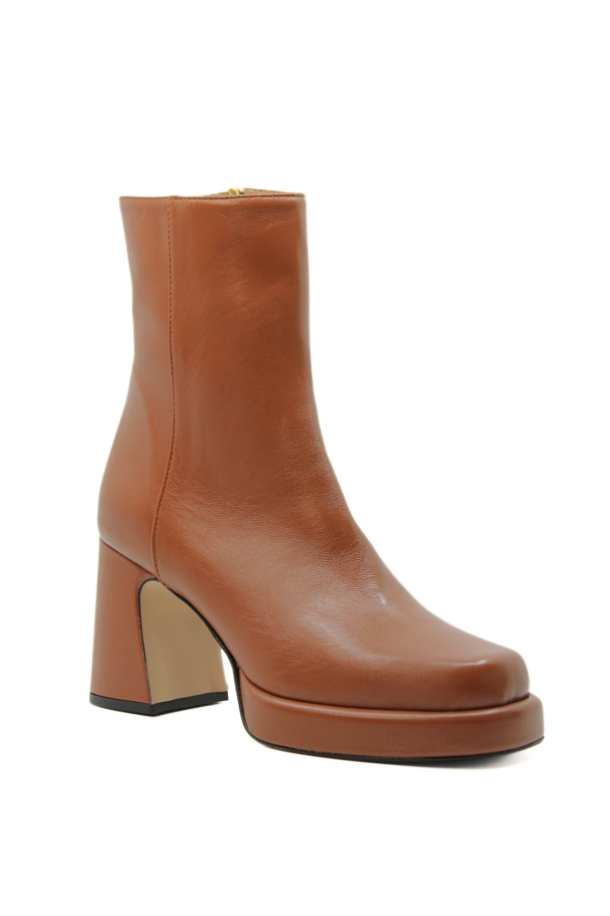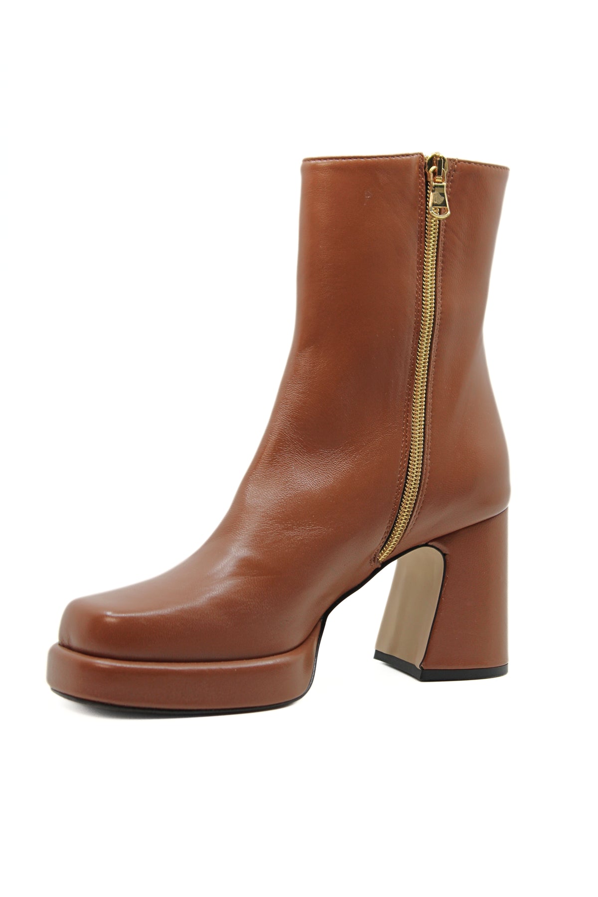 Tronchetto in nappa cuoio ,con tacco svasato di 6cm e plateau di 2cm rivestiti in pelle, molto leggeri. Zip interna laterale. Adatto per chi non vuole rinunciare al tacco e alla comodità