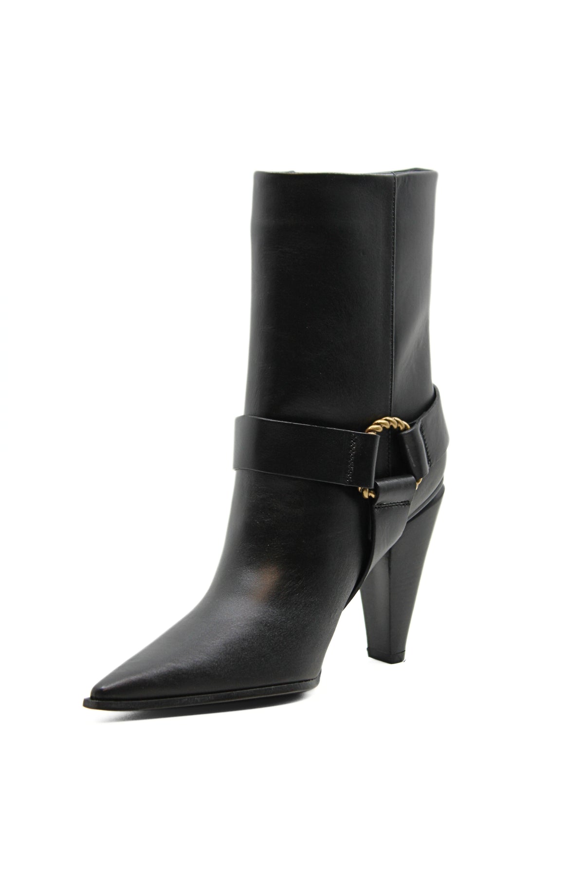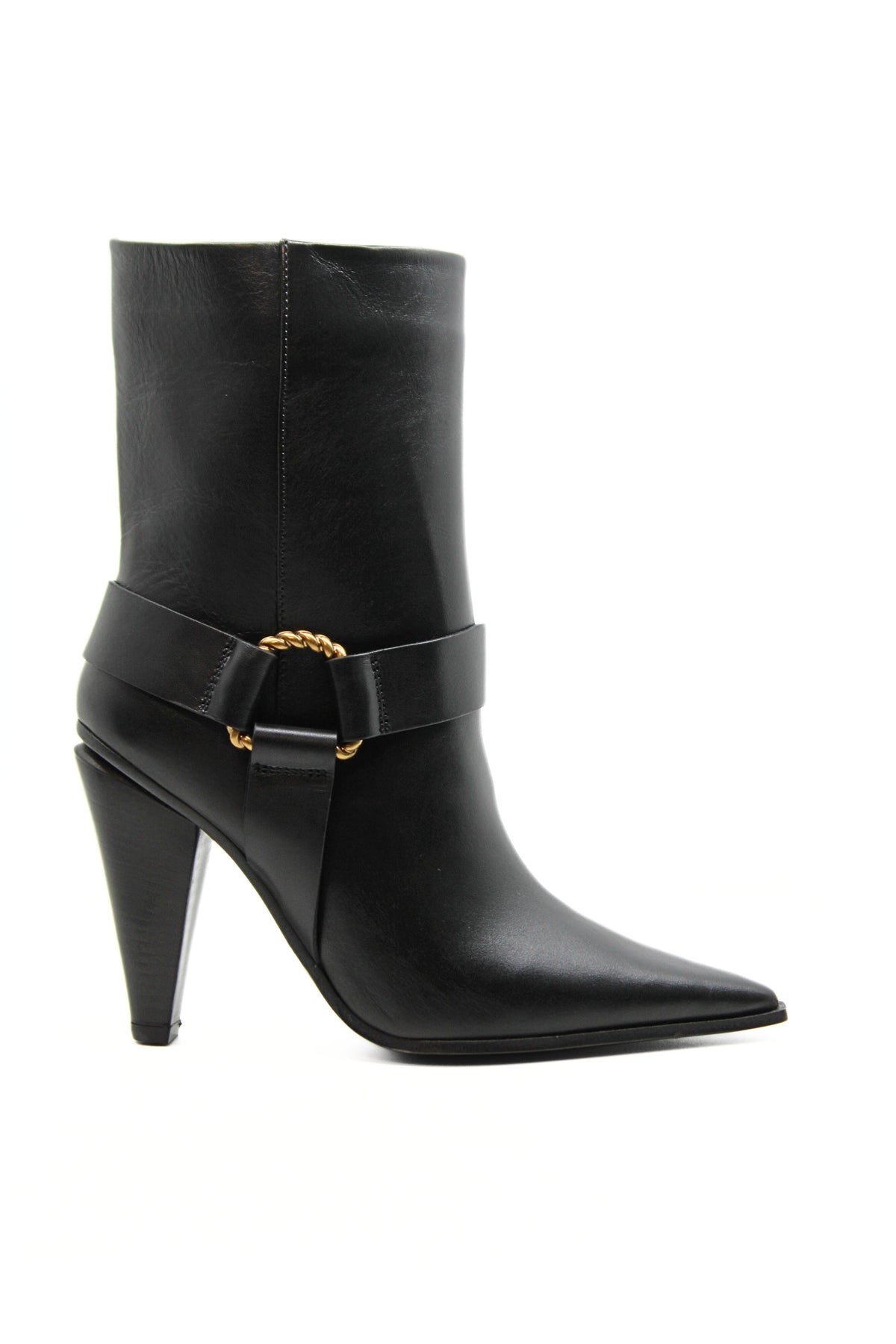 Tronchetto di alta moda by Roberto Festa Milano in nappa nera. Suola in vero cuoio naturale e gomma antiscivolo ad intarsio. Tacco cono alto 10cm. Accessorio decorativo sul gambale in pelle, bloccato da un anello in metallo oro. Forma a punta e finale leggermente quadrato. Per un look davvero esclusivo e ricercato.