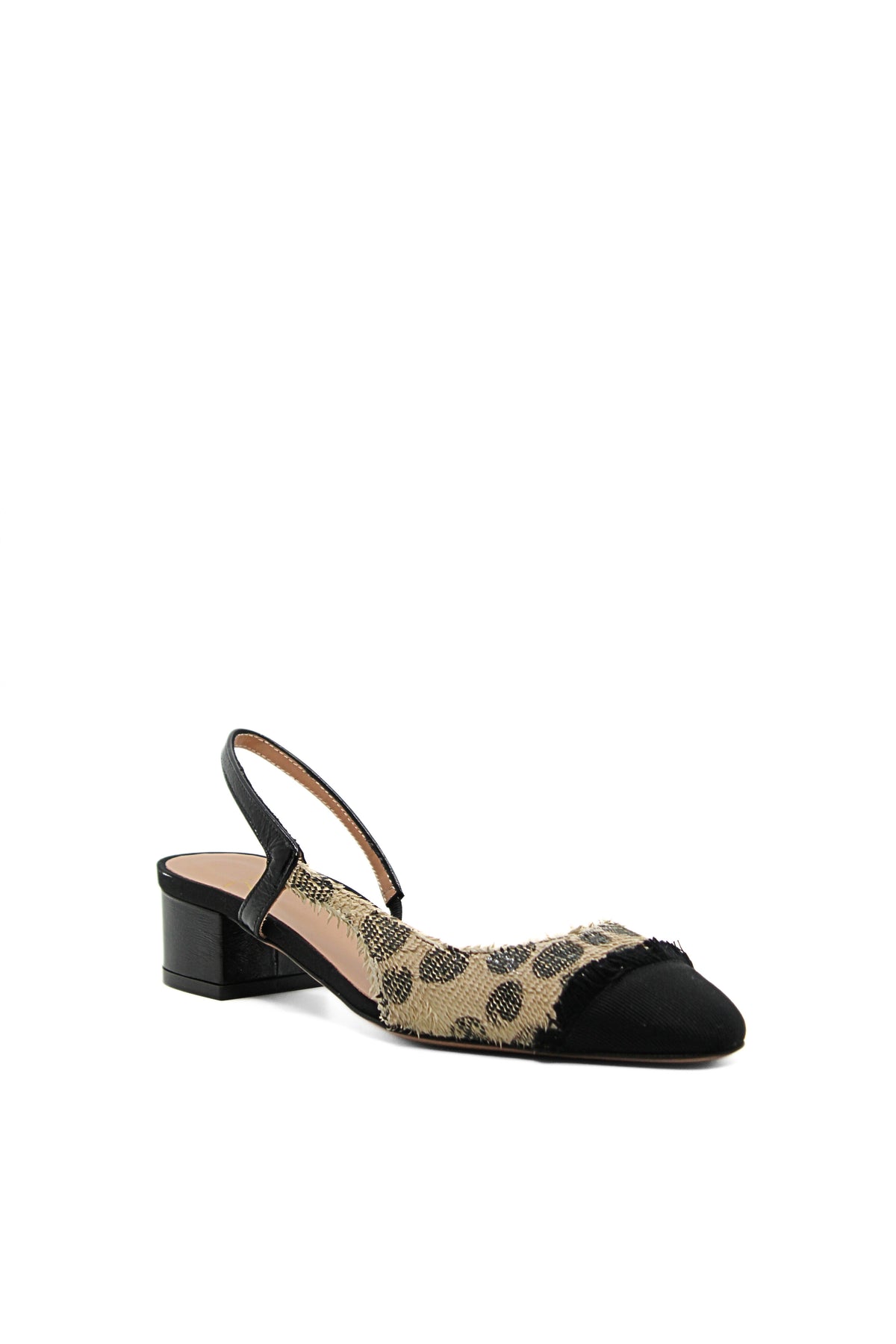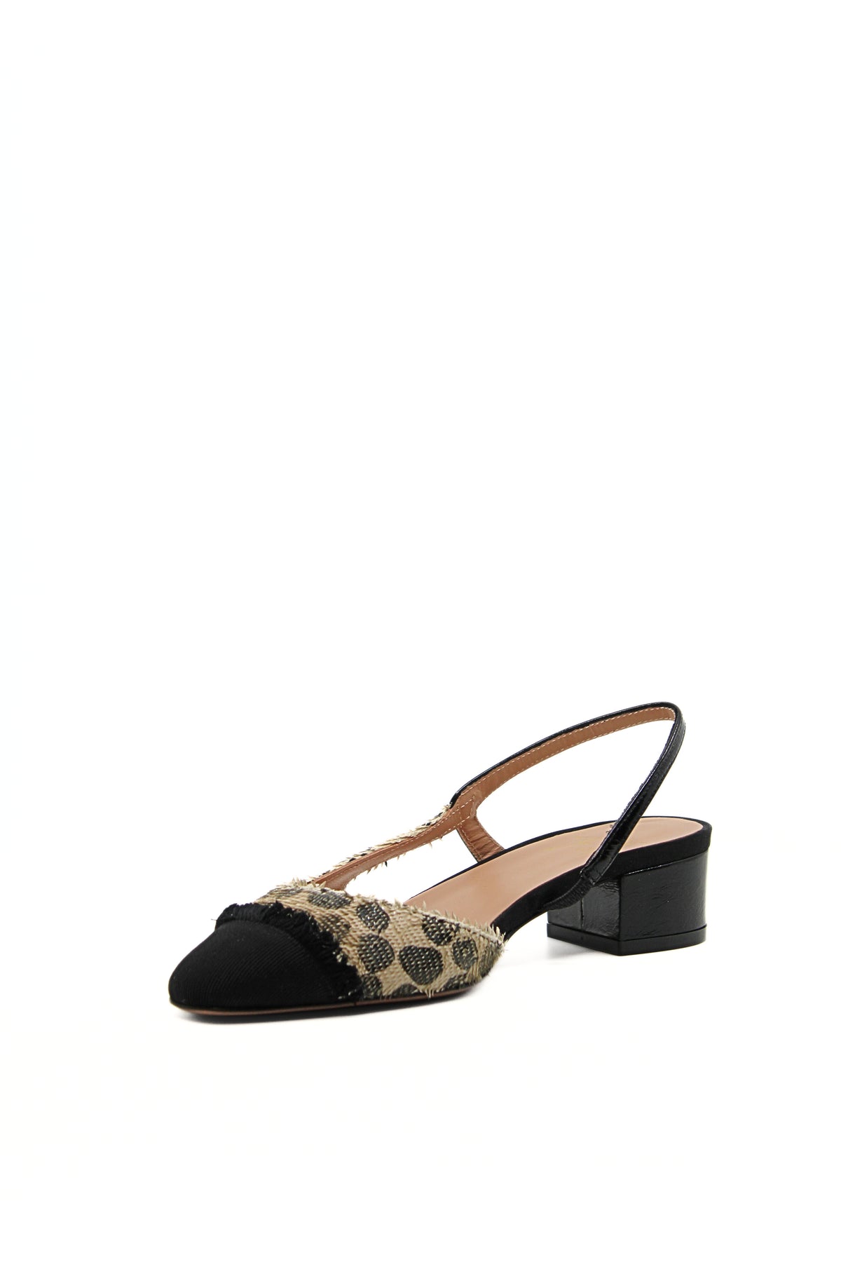 Slingback modello chanel in pelle squamata stampa pois, con punta rivestita in tessuto liscio nero leggermente sfilacciato all'estremità. Suola in vero cuoio naturale. Sono perfette sotto outfit chic senza rinunciare alla comodità.