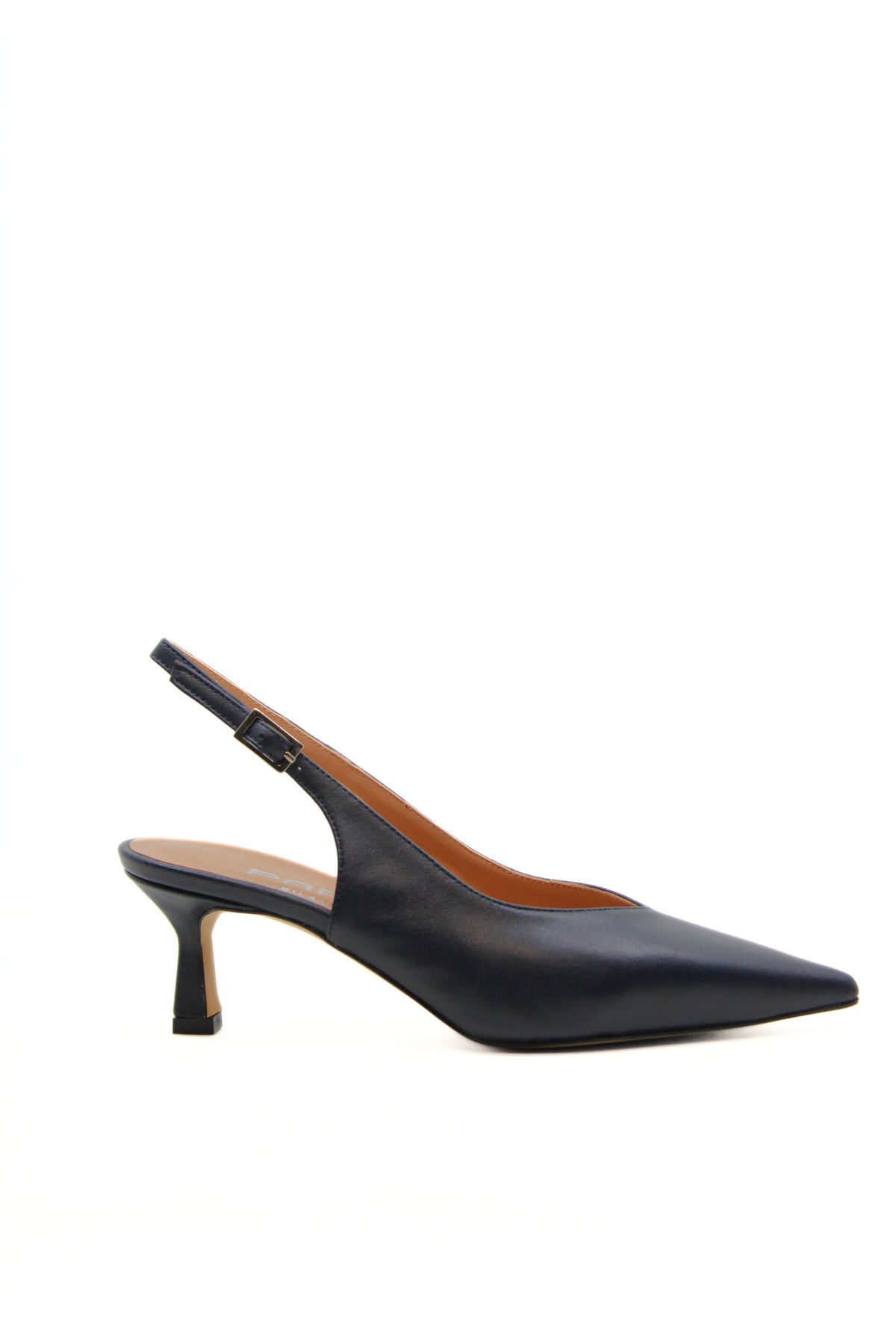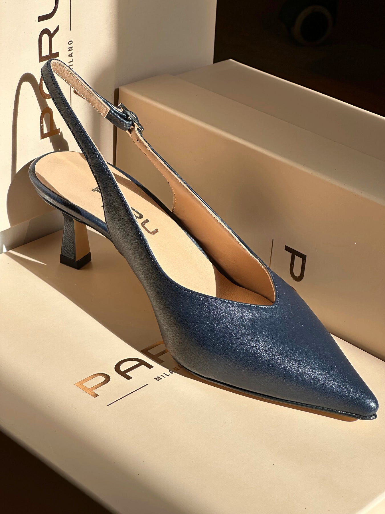 Slingback in nappa blu notte con tacco a rocchetto, comodo e stabile, alto 5,5cm. Scollo a cuore con cinghietta regolabile. Pianta comoda e super comfortevole, anche per chi ha problemi di alluce valgo o pianta larga. Perfetta per le occasioni importanti, dal gusto lineare e ricercato. Per chi ama la bellezza e la semplicità senza rinunciare alla comodità