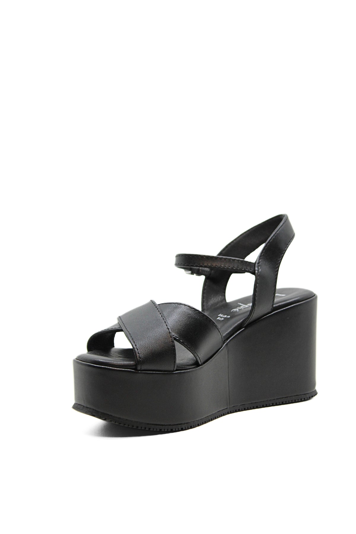 Zeppa in pelle nero con fasce incrociate sul davanti e braccialetto regolabile alla caviglia. Altezza zeppa 9cm e plateau sul davanti di 4,5cm. La pianta è caratterizzata da un morbidissimo plantare in memory per un comfort unico. Per un look esclusivo senza rinunciare alla comodità.