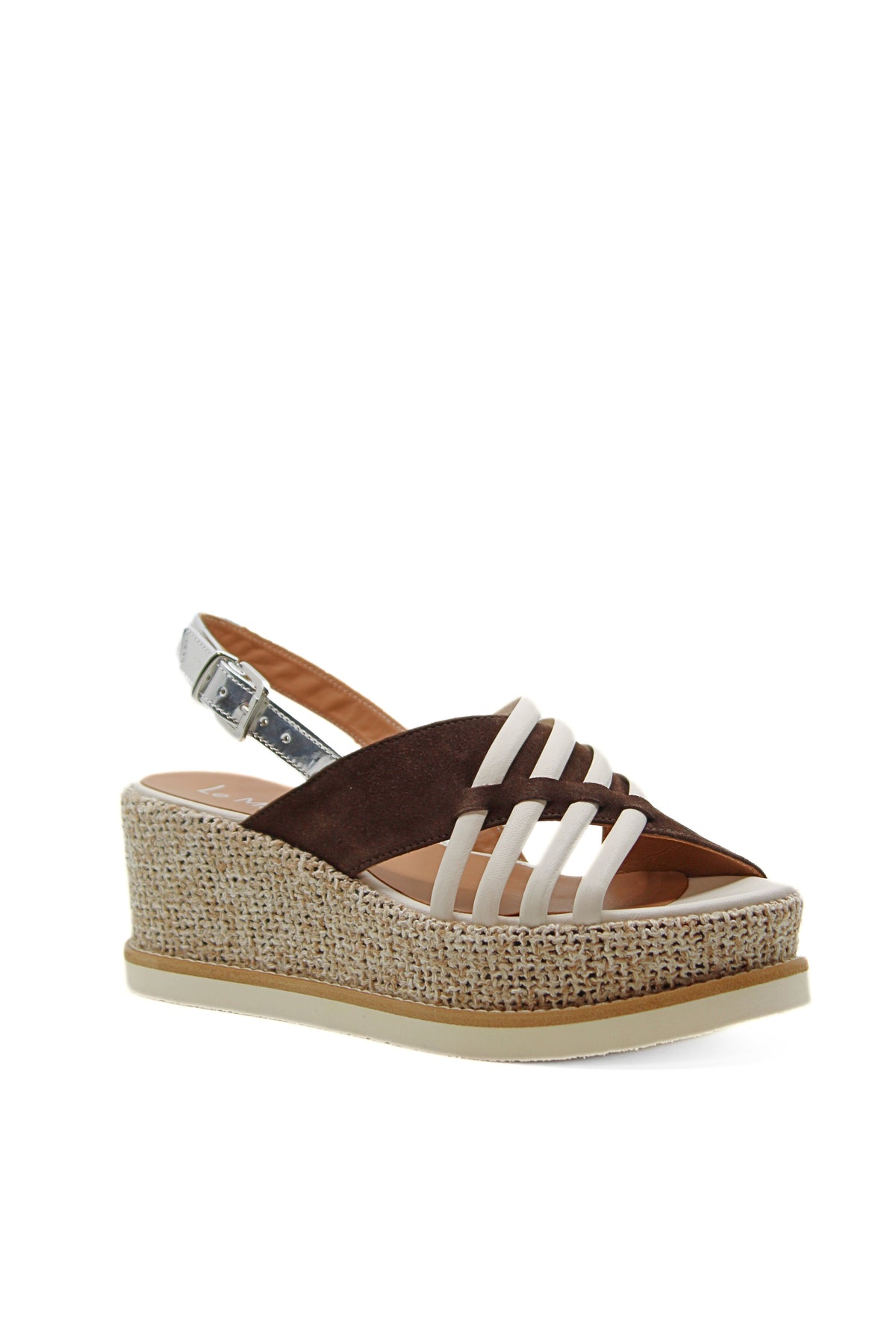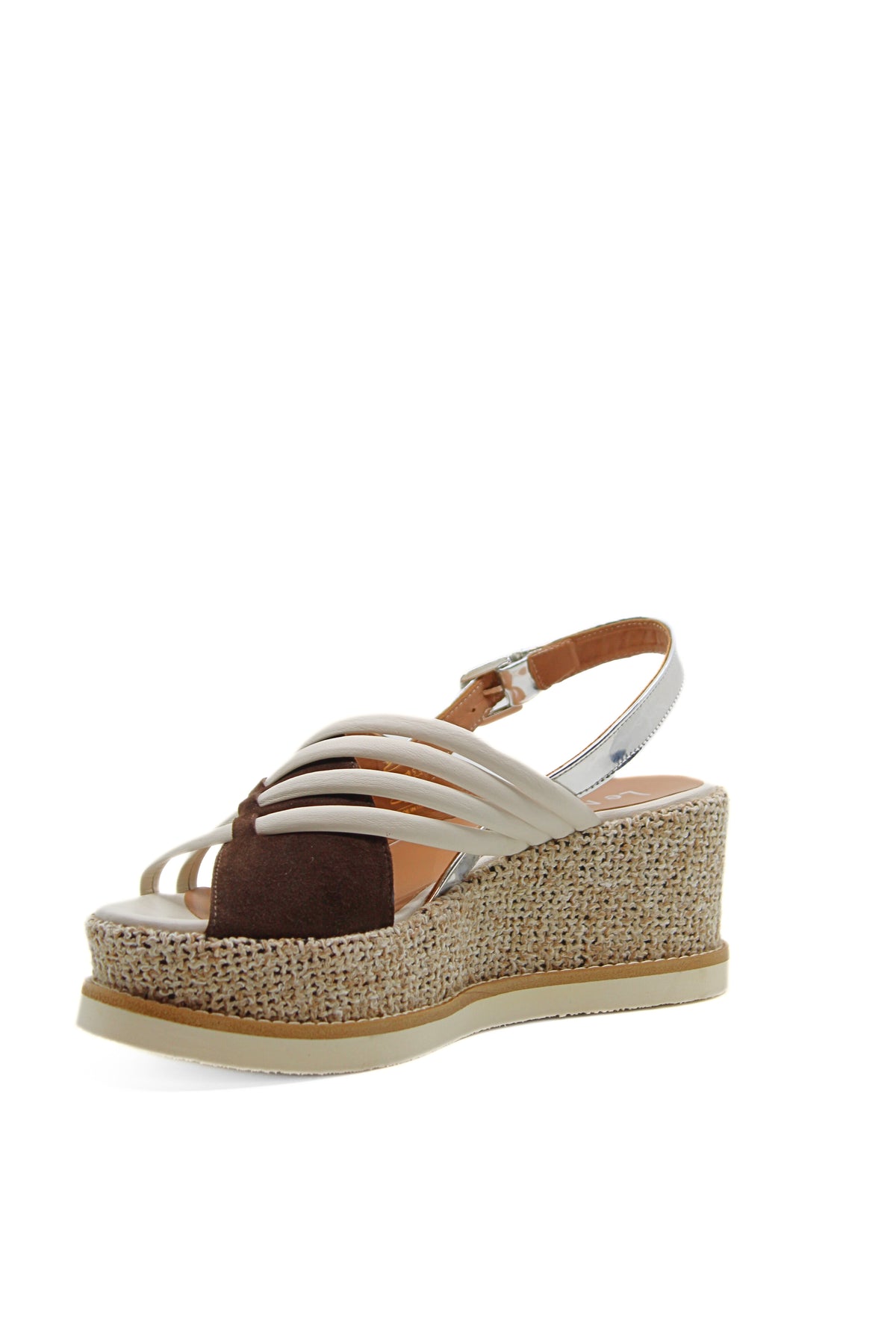 Scarpa in Pelle con fasce incrociate sul davanti latte e camoscio testa moro. Perfetta per piante importanti. Plantare comodissimo. Zeppa alta 6,5cm rivestita in tessuto pregiato beige. Per un look esclusivo senza rinunciare alla comodità.